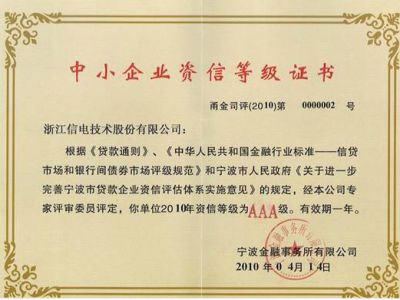 经专家评审委员评定,米兰·(milan)获得了2010年度中小企业最高级别的资信等级——AAA级。 浙江信电首次参评中小企业资信等级,直接...