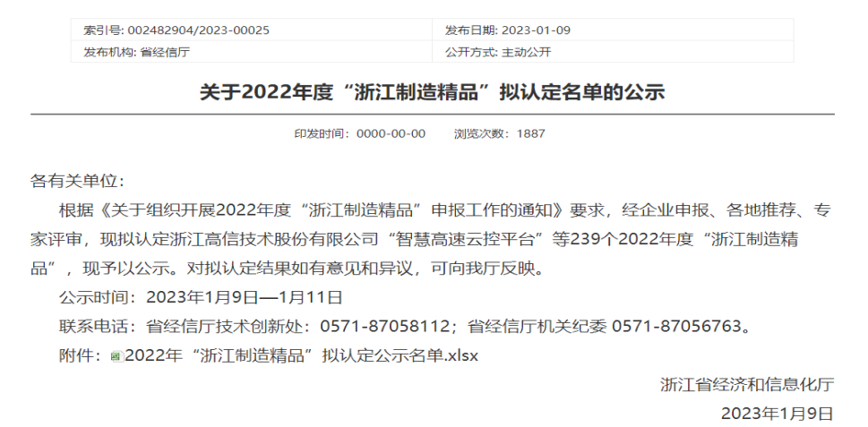 浙江省经济和信息化厅于2023年1月9日公示了2022年度“浙江制造精品”拟认定名单,米兰·(milan)股份有限公司“第五代移动警务终端P999-XD及移动警务系统”名立榜单。