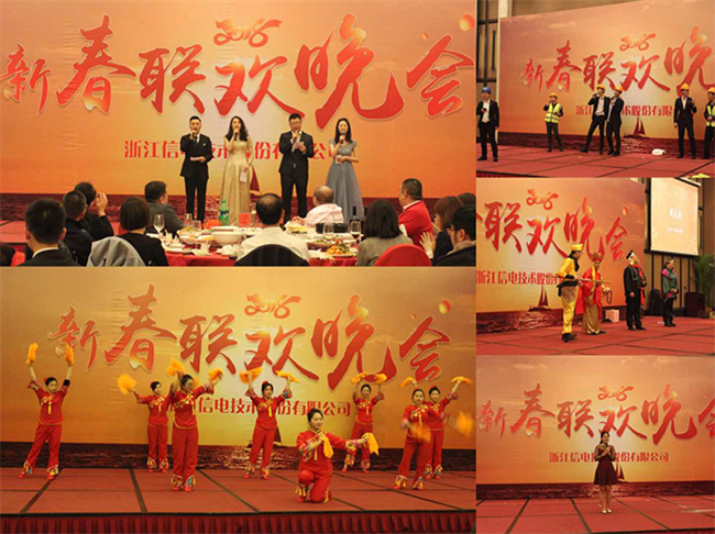 当晚,公司精心筹备的新春联欢晚会在期待中拉开帷幕。晚会以新颖独特的沙画视频动态开场,讲述了浙江信电过去一年的发展变化,随后出场的是充满青春活力的舞蹈《开门红》拉开了红红火火的序幕。晚会中,小品、歌曲、舞蹈等节目轮番登场,展现了信电人积极向上的精神面貌。从50个阳光普照奖到苹果手机,再到总经理周时耀临时增加的27个奖项,一轮一轮的抽奖中,欢笑声一浪高过一浪。